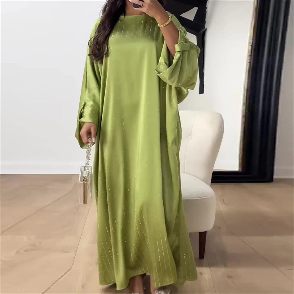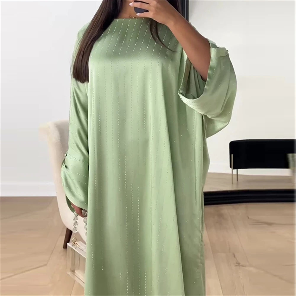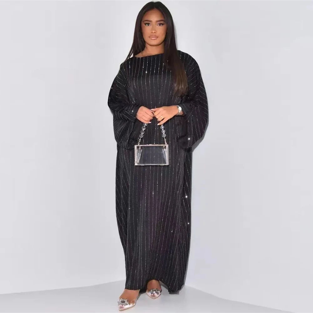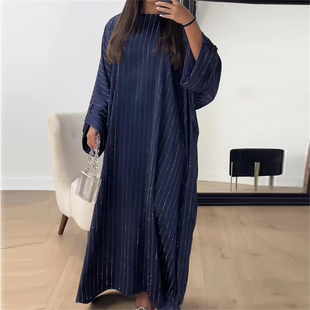 This evening abaya combines a flowing cut with an elegant striped design. Its loose silhouette ensures absolute comfort, while its subtle details enhance your look discreetly.