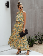 Dieses lange Boho-Kleid verführt durch sein strahlendes Blumenmuster und das raffinierte Bindeband um den Hals. Der fließende Schnitt betont subtil die Silhouette und bietet gleichzeitig idealen Komfort für heiße Tage. Perfekt für einen Sommerausflug oder einen Stadtbummel.