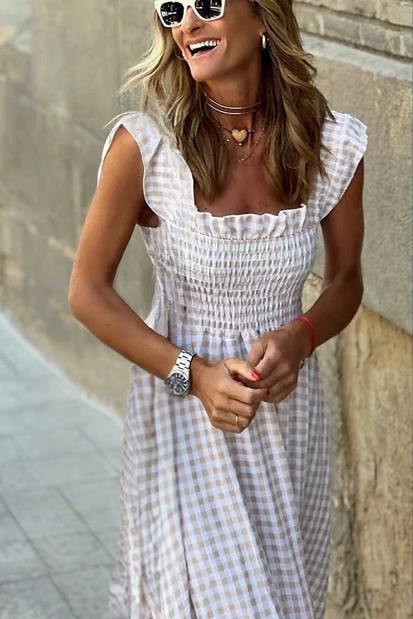 Ajattomalla ruutukuviolla ja smokkivyöllä varustettu mekko korostaa siluettia elegantisti. Sen virtaava leikkaus takaa optimaalisen mukavuuden, ja se sopii niin arkeen kuin juhlavampiin tilaisuuksiin. Täydellinen tasapaino tyylin ja keveyden välillä.