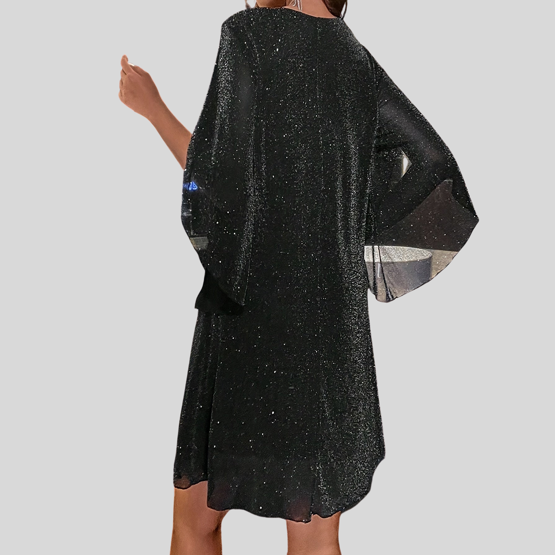 Tämä lyhyt kimaltava mekko on täydellinen iltoihisi. Sen V-mallinen kaula-aukko korostaa siluettiasi. Saatavilla useissa väreissä ja kooissa.