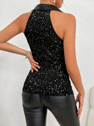 このノースリーブトップは、夜の装いに洗練されたエレガンスと微妙な輝きを融合させています。テーラーカラーが洗練された印象を与え、ラメの効果が星空を思わせます。ウエストにフィットしてスタイルを引き立てます。特別な外出時に自信を持って輝くのにぴったりです。