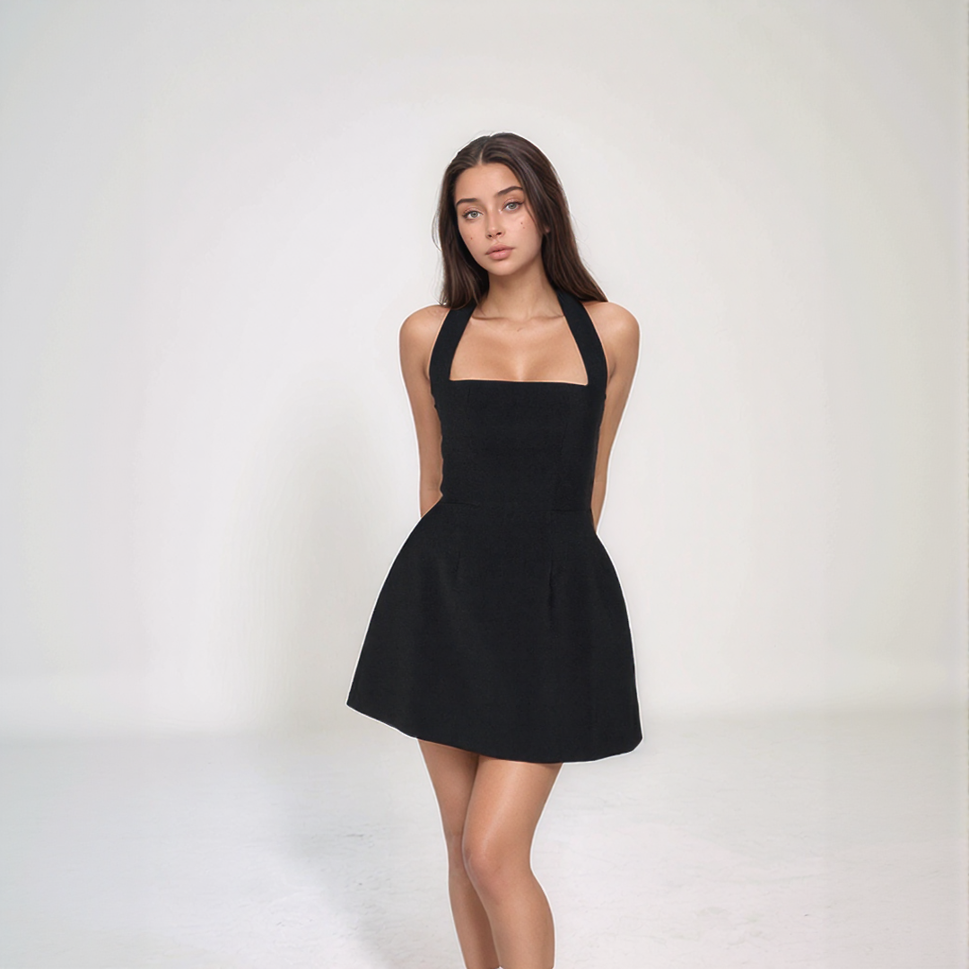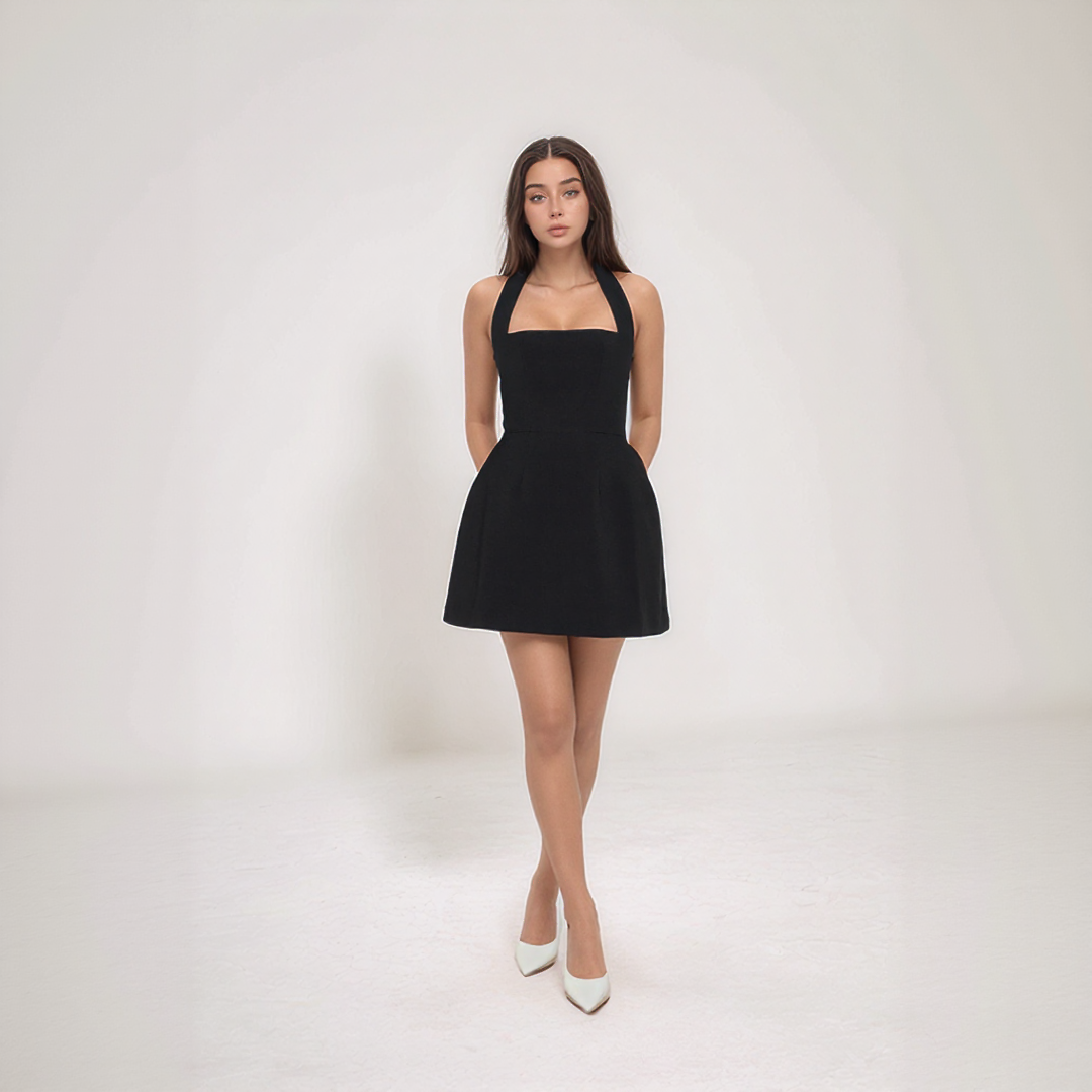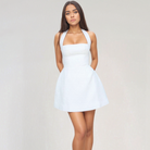 サンドラ | ミニドレス – ハルターのデコルテと流れるようなボリューム