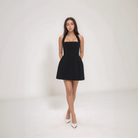このミニ夏ドレスは、肩を美しく見せるデコルテが魅力です。フレアカットは、動くたびに軽やかさとエレガンスをもたらします。晴れた日やスタイリッシュな夏の外出に最適です。