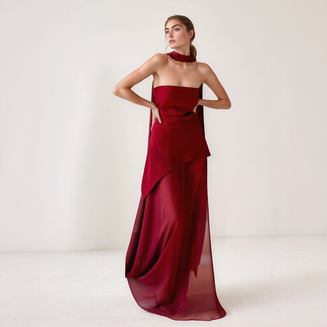 ネリー | エレガントなロングドレス – アシンメトリックカットと統合されたスカーフ
