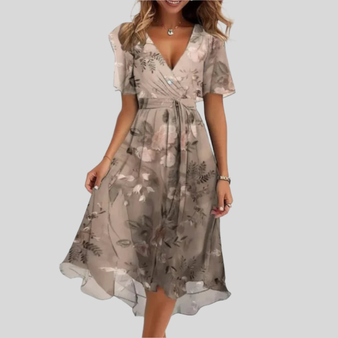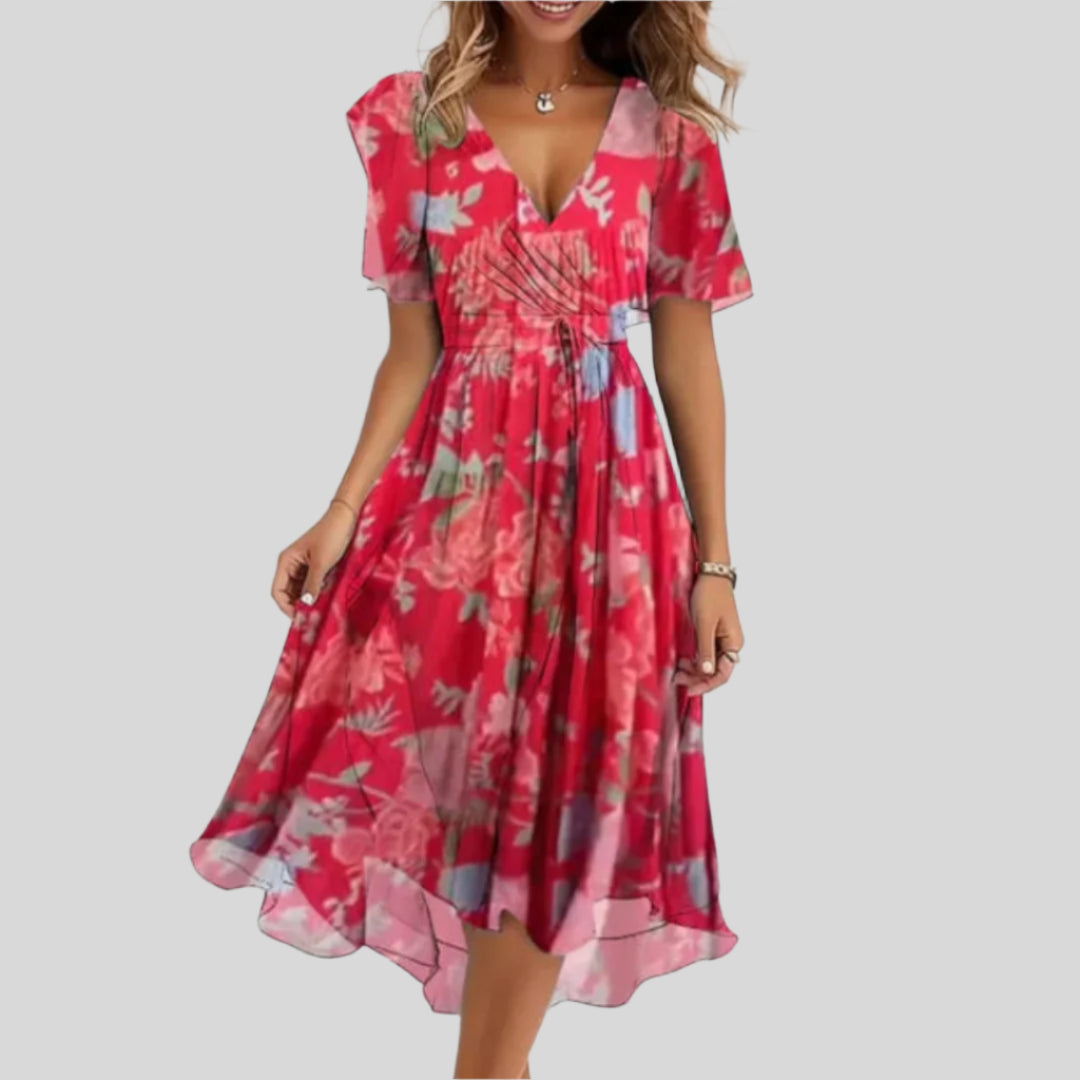 Elodie | Rochie Fluidă cu Imprimare Florală și Guler în V