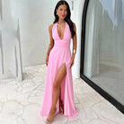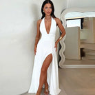 Táto dlhá šaty majú hlboký výstrih a vysoký pás, ktorý zvýrazňuje vašu postavu. Odvážny rozparok a jemné viazanie pridávajú nádych sofistikovanosti. Ideálne na elegantné večery a špeciálne príležitosti.